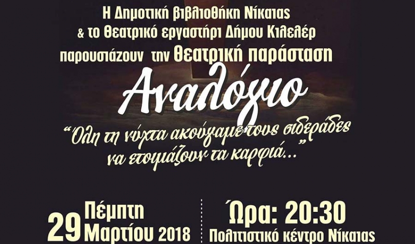 Η Δημοτική Βιβλιοθήκη Νίκαιας και το Θεατρικό Εργαστήρι Δήμου Κιλελέρ παρουσιάζουν την θεατρική παράσταση - αναλόγιο « … όλη νύχτα ακούγαμε τους σιδεράδες να ετοιμάζουν τα καρφιά …»