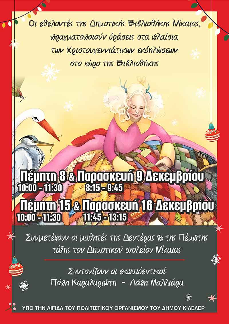 Οι εθελοντές της Δημοτικής βιβλιοθήκης Νίκαιας πραγματοποιούν δράσεις, στο πλαίσιο των Χριστουγεννιάτικων εκδηλώσεων που διοργανώνει ο Δήμος Κιλελέρ, στο χώρο της βιβλιοθήκης.
